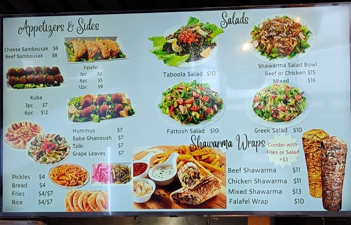 Complement your meal with delicious side skewers including Chicken, Beef, Kufta, and even Salmon for a seafood twist, starting from $6.25. If you're in the mood for kabobs, options like Chicken Kabob and Lamb Kabob will not disappoint.